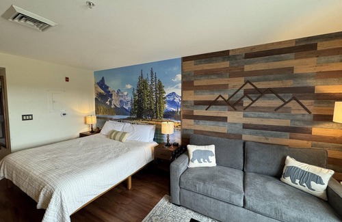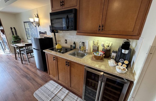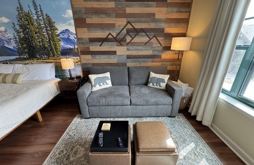 This beauty features a NEW King size bed, a living room area with a new pullout sofa, storage ottomans, gas fireplace, kitchenette with new pots and pans, a ceramic stove top, near full fridge, luxury wine and beverage fridge, microwave, K-cup coffee-maker, toaster, 2-4 person dining table, Air Purifier, Liv Vac (safety), Bath Robes, Wall Hooks, Hiking Poles and a full bathroom with a towel warmer.