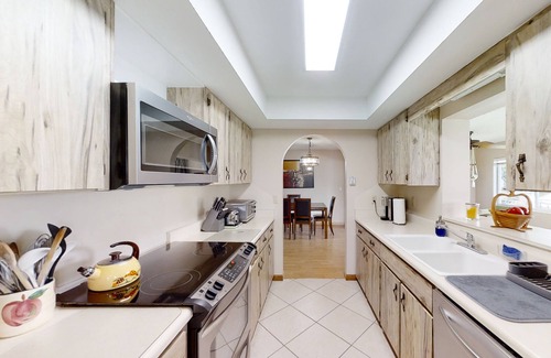 As you enter this sunny home away from home, the front porch greets you with two inviting chairs where you can unwind and watch people come and go. This space flows seamlessly into the living room, one of the best gathering spots this retreat has to offer. Spread out comfortably on the sofas and watch an entertaining show or movie on the smart TV with streaming services. Another great gathering place is the sunny family room off the kitchen which enjoys great views of the backyard, dock, and canal. Speaking of the kitchen, the home's galley-style kitchen is ready to help you prepare the most delicious culinary masterpieces for the group. It's complete with all the essentials, including a dishwasher for easy clean ups. And if you would like to take mealtime up a notch, the back porch offers an outdoor dining area with an electric grill for year-round cookouts. Off the kitchen is a designated laundry room with a washer/dryer, so all you have to do is toss in your laundry and don't worry about it anymore. Additional perks include free high-speed WiFi and central AC.