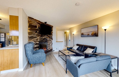 When you're ready to relax and unwind, head back inside where the spacious living room features plush seating, a fireplace, and a large TV. As you stream your favorite shows here, the chef of your family can utilize the full kitchen's ample meal prep space and stainless steel appliances to prepare delicious dishes.