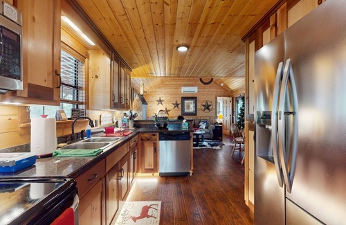 This rustic charmer boasts a welcoming living room with vaulted ceilings and wood accents throughout. Curl up on your favorite sofa and get ready for a tranquil yet entertaining evening streaming your favorite shows on the smart TV while the chef of the group treats everyone to delicious homemade meals prepared in the well-equipped kitchen. The cabin also has a large front porch where you all can lounge, take in the gorgeous views, and simply relax while creating everlasting memories together.