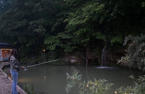 Come and relax at our waterfall cabin. Camping with some luxuries! Like to camp but like certain luxuries as well we have this peaceful gorgeous cabin for you to stay! It’s that camp feel with an outdoor shower and A/C. Need to charge phones or those tablets to read books on we have electric to that! Bring your cooler and cook a meal on our fire pit grill combo!