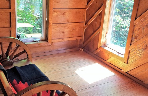 The house is furnished with craftsman cedar tables, bedframes, dressers, and chairs, comfortable lounging furniture, and everything you’ll need in the kitchen, including a dishwasher, washer, and dryer. The bedrooms include one on the main floor (queen bed, overlooks waterfall) and two on the 2nd floor (one queen bed in loft area with smart TV and DVD player with 50+ DVDs, one comfortable futon in room overlooking waterfall). The "great room" has a vaulted ceiling, a large wood-burning fireplace, a smart Roku TV with Netflix and Amazon Prime Video, and a dining room overlooking the beautiful waterfall. There is also a bonus room on the 2nd floor overlooking the waterfall that can be used as a 4th bedroom with tri-fold foam mattress (provided) or an office with a spectacular view. You will also have access to all of the comforts of home such as robes, dinnerware, flatware, spices and herbs, pots and pans, cookie sheets, bedsheets, pillows, towels, blankets, etc.