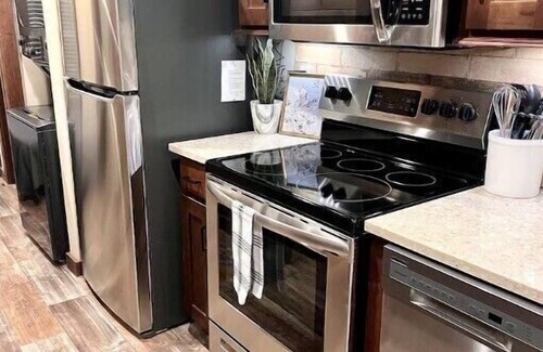 In house laundry, fully stocked kitchen, and nice bathroom makes your stay a little easier. Please remember that this cozy tiny home loft is accessible via stairs and doesn't allow standing room.
