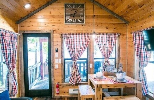 Every cabin is specially equipped with everything you need to enjoy your time at the lake. This 1-bedroom lakefront tiny house sits on the water’s edge. Its private porch offers spectacular views of the lushes wooded wilderness and gentle ripples of Lake Wylie.