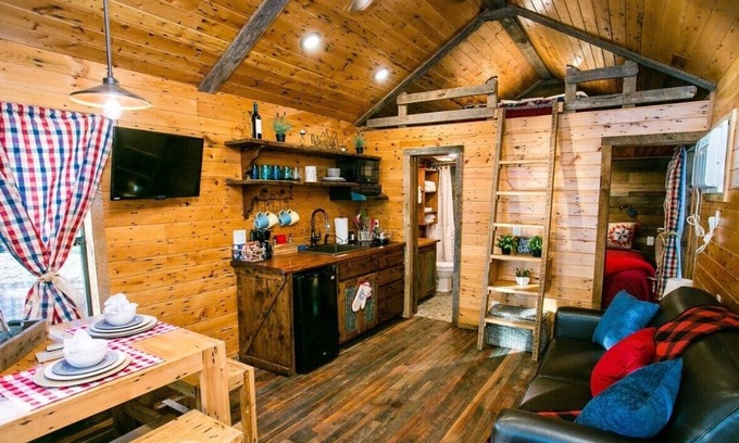 This tiny house cabin boasts a bedroom with a queen bed, a loft with a queen bed. The kitchen dining area seats 4 comfortably.