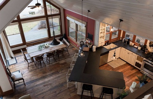 The Main House has 3 Bedrooms and 3 bathrooms plus an expansive upper living area with 2 sets of twin/full bunks and 2 additional trundle twins. Large lakefront windows provide sensational views of the lake from every angle. The open main floor living area with beautiful reclaimed wood floors has a large fireplace anchored at one end, and a gourmet kitchen at the other, complete with stainless steel appliances, granite countertops, walk-in pantry, and all the food prep and cooking/serving implements you could want.