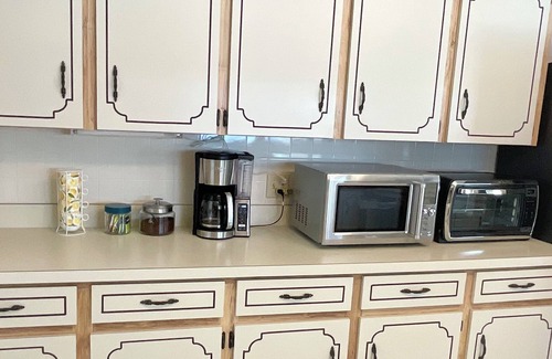 Large kitchen is fully equipped with appliances and also has counter seating for 4. (Please note, kitchen/laundry room tile is extremely slippery when wet.)