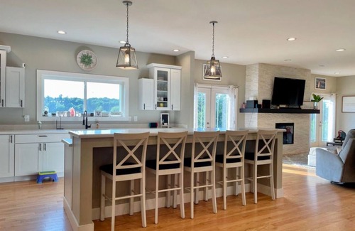 MAIN LIVING SPACE: You will find a laundry room with washer and dryer, also a tanning bed with full access to use to renter, open concept living room with a 86' Smart TV and electric fireplace. A playroom or second living space with a 65' Smart TV. Open Kitchen and dining room the kitchen includes views over the river to die for. Wine Refrigerator, dishwasher, farmhouse sink and microwave. The bar has seating for 5. The dining room has a table that seats up to 6. There is a desk with a office chair to do a little work if needed. You will find access to the sunroom and porch from both the dining room and the main front door. There is 1/2 bath on main floor.