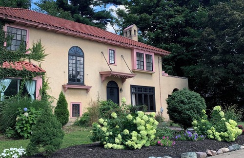 Relaxing Bullough's Pond awaits you at this 5-bedroom house. Our property features 1 king bed, 2 queen beds, and 2 full beds. Our amenities include a fully stocked kitchen with a 10 foot island. Entertainment seating seating for 24 diners inside and out on the covered Veranda. washing machine, and WiFi, guests will feel right at home. The 2 bathrooms come equipped with a hairdryer, shower, and , antique waterfall bath. 2 bedrooms with uninterrupted water views, Beamed and sunken living room, working beehive fireplace, fire-pit, propane grill. Fenced in pet friendly yard. New this year- a ground floor suite! Our beautiful grounds will delight your family and guests.