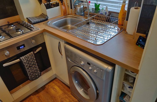 The kitchen is compact but equipped with a washer, dryer, fridge freezer, oven and hob.