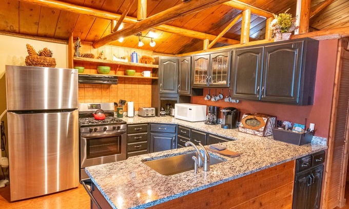 Bear's fully stocked kitchen includes spices, utensils, dishes, pots, pans, a crock pot, microwave, tea pot, toaster, blender, gas stove, an ice maker in the freezer, and a dishwasher, as well drip coffee and Keurig coffee machines. The dining area seats 6. Fresh towels and linens are provided.
