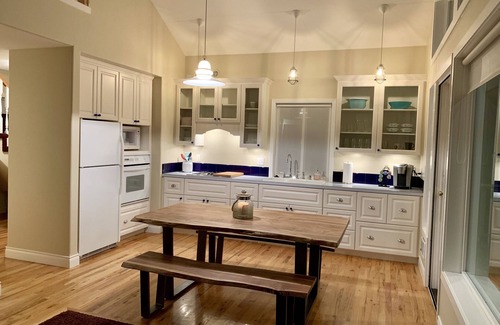 The fully-stocked gourmet kitchen features white cabinetry and includes pots, pans, toaster, microwave, Instant Pot, Keurig coffee maker and blender, cooking utensils and some seasonings. We will leave you a dozen of our favorite K-cups, but feel free to bring your own stash of coffee and seasonings as well!