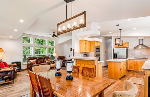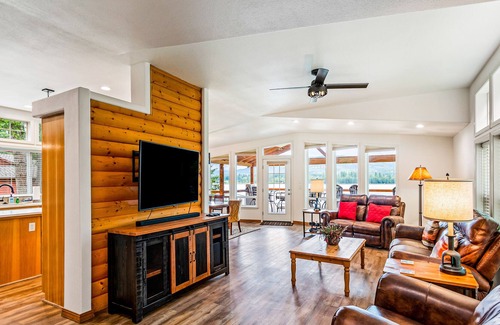 Take your next vacation at this exquisite waterfront cabin with an amazing view of the mountains! Step inside and be welcomed by large windows with views from every room, a spacious living and dining area with a flatscreen TV with comfortable couches. The full kitchen has custom wood cabinetry and doors and stainless steel appliances. After a full day, sit on the covered deck with a drink in hand and watch the sunset or take out the canoe into the river.