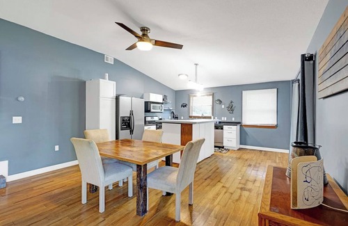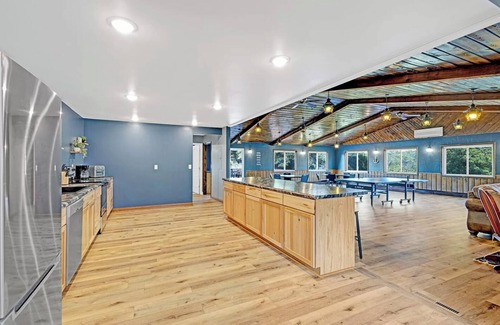 Your stay at this inviting cabin includes a variety of amenities that cater to your every need. The property features a huge recreation room equipped with ample seating, a propane grill, and a pellet smoker, ideal for hosting post-wedding gatherings. The outdoor space is expansive, including a private area with a large yard perfect for yard games and activities. Enjoy breathtaking lake views, cozy campfires by the water, and a private dock, providing direct access for swimming, fishing, or simply relaxing on the sandy shoreline. For larger groups, you can reserve both the upper and lower units, which includes additional sleeping arrangements and a full kitchen to accommodate your guests comfortably.