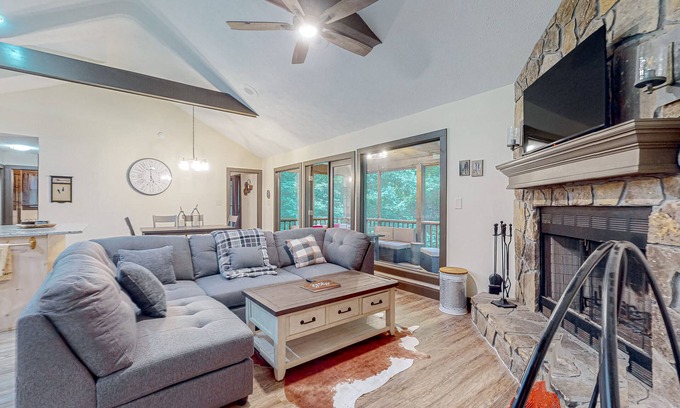 As soon as you enter this creekside home, you'll be welcomed by a spacious, open floor plan with vaulted ceilings, exposed wood beams, and plenty of light. The well-equipped kitchen has everything you need to prepare full-course meals or quick snacks on the go. Keurig and drip coffee makers are available and ready to please the coffee enthusiasts in your group. Enjoy a homemade feast, then retreat to the welcoming living area furnished with comfy sofas in front of a gorgeous wood-burning fireplace. Watch a favorite movie or show on the large TV or break out any of the provided board games for an entertaining evening at home. The enclosed deck off the living area offers a lovely space to unwind around the fire table or host memorable barbecues using the gas grill.