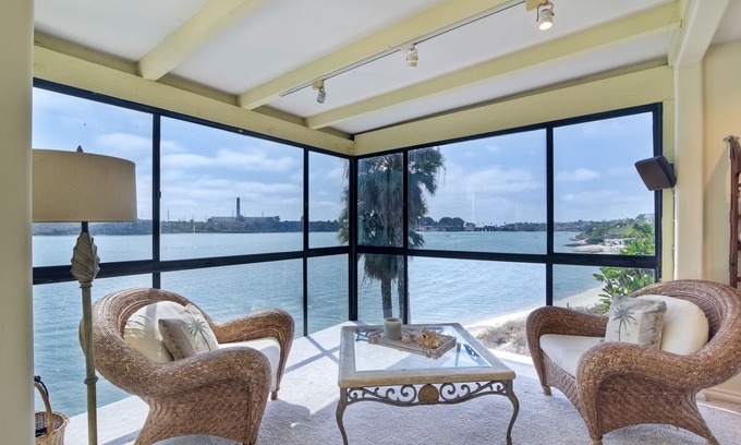 One month minimum rental. Elevator currently out of order with no date of repair provided by HOA. Third floor unit. Step into this sun-drenched oasis nestled on the Agua Hedionda Lagoon in coastal Carlsbad! As you enter, you'll be greeted by stunning water views, soaring vaulted ceilings and a wall of windows that bring in the view and lovely ocean breezes. A cozy fireplace adds warmth and ambiance to the living area, while ceiling fans keep you cool and comfortable during those warm summer days. The sun room is a perfect place to curl up with a book, take a nap or enjoy watching the paddle borders, jet skiers and water skiers on the lagoon. Located on the top floor of the building, this unit overlooks a sparkling pool, hot tub, and little beach. Professionally decorated in California nautical/beach-style, the master bedroom has a queen bed with a water view and a second bedroom with twin trundle beds. With two assigned and gated parking spaces, you'll never have to worry about finding a spot for your vehicles. Built in office desk with computer and printer, high speed wi-fi, full stocked kitchen, all linens, towels and beach equipment. There is a newer washer and dryer and stainless steel Kitchen Aid appliances including a 2 door refrigerator, electric flat top stove, oven and microwave. You'll also be close to shopping, dining, and entertainment with easy access to I-5. Very comfortable home for entertaining & relaxing. All together, you will have everything you need to enjoy a fabulous time in sunny San Diego!