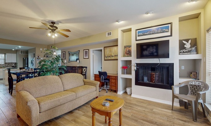 Updated furnishings and appliances ensure modern home comfort and convenience throughout your stay. The well-appointed kitchen is equipped to satisfy even the most discerning of home chefs. The open-concept design seamlessly blends the living room and dining area. You can stream shows and movies on the smart TV or catch up on some remote work at the dedicated desk. The primary suite boasts a large private bathroom and an enclosed patio that is separate from the main outdoor space.