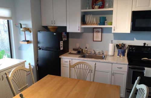 The condo includes a well equipped kitchen. We've tried to think of everything our guests might need to prepare meals. Even a large stock pot for shrimp or crab boils and a small charcoal grill on the patio. For coffee drinkers, a coffee maker or a pour over and a coffee grinder are provided. The relaxing patio is perfect for enjoying the gorgeous sun rise or an evening glass of wine.