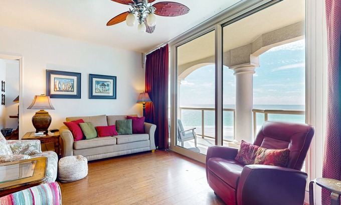- Gulf-view condo with pool, hot tub, beach access, tennis, balcony, AC, & W/D