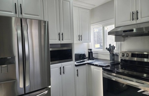 The fully equipped kitchen with an island and includes a fridge, stove, dishwasher, microwave, coffee maker, toaster, kettle, all pots, pans, dishes, cutlery, and BBQ. Enjoy many movies and 65 inch TV with an internet connection. A washer & dryer is also available inside the house.