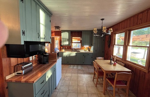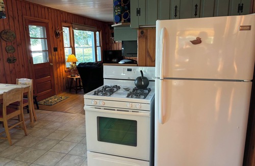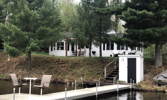 This 2-bedroom, one bath cottage is located at the end of the quiet paved road giving your stay extra privacy. The outside patio gives you an extra dining area with a great view of the lake. The indoor space includes a 4 seasons porch with a gas fireplace. Amenities during your stay include WIFI, central AC and heat, new appliances, DVD player with assorted movies, CD player, lakeside patio with table set and umbrella, new charcoal grill and an outside fire ring. The cottage is tastefully decorated with a vintage up-north theme. The kitchen is well equipped with new cookware, Keurig and a pantry for all your cooking needs. There is a high-definition Sony TV with Netflix and Amazon Apps for your spare time movie enjoyment. New for the Summer of 2025 will be a vintage bunkhouse for two. Perfect getaway for kids to enjoy their unique lake experience.