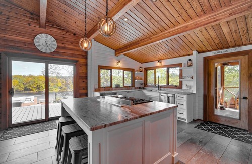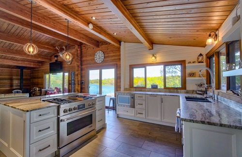 This open concept three bedroom cottage with den was newly renovated in 2018. It has heated floors in the kitchen and bathrooms and a large granite island with seating. There are two large dining tables, one in the great room which has vaulted ceilings and the other in the beautiful three seasons Muskoka room. The spectacular multi level deck with glass railings gives you an uninterrupted view of the bay, whether having a coffee, a glass of wine or relaxing in the hot tub. The fire pit area overlooks the lake and is equipped with several Muskoka chairs for you to enjoy a campfire. Please note there is video surveillance on the exterior entrance of the cottage/property for security.