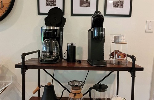 If you are like us and love coffee, you will love our coffee bar! Start with some fresh beans and grind them up. Then, try a traditional drip coffee maker, pour over or Keurig.