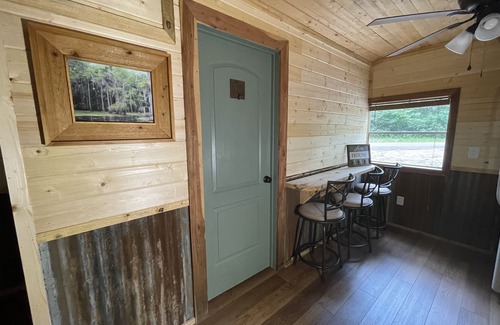 New Cozy Cabin on the water at Caddo Lake. Enjoy evenings in the screened in porch after a day out fishing or kayaking. Great fishing right on the property at the waters edge! Kayaking or boating right up to the property. Tie off on our new dock just steps from the cabin. Enjoy s'mores at our fire pit with 6 Adirondack chairs, gorgeous view of the water in the Cypress forest, fireflies, beautiful sounds of the forest birds and lots of Hummingbirds. One room/ one bath with full kitchen. Granite counters and interior covered in beautiful wood. Cold AC/warm heater for winter. Flat screen TV and WIFI. Huge covered/ screened in porch with cafe lighting, two tables with 4 chairs each and futon- all to enjoy the sights and sounds of the outdoors. Futon in the screened in porch is queen sized if you like to sleep outside. Inside is a luxury Queen bed and a queen sofa sleeper. Sleeps 4 inside with two outside on porch. Two Kayaks, paddles and life jackets included with cabin.