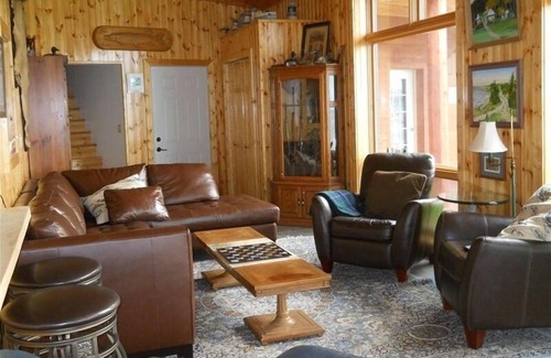 The lakefront beach offers great swimming) and water fun opportunities for water lovers (rocky bottom). Enjoy the starry night in the hot tub located on the lakeshore (open May 1st through end of October). The property is located only two minutes walking distance from a marina. The house has an attached roomy three car garage used as a game room on the main floor (shared with another unit) with an easy access to the unit. The open floor concept allows great flow between the living room, dining room and the kitchen with beautiful tile and wood flooring and Scandinavian imported wood wall paneling. The kitchen has gorgeous granite counter tops and rich cherry colored cabinetry. All basic kitchen appliances (gas stove with oven, microwave, toaster, regular coffee maker) and dishes are available. The newly remodeled modern looking spacious easy access tiled bathroom on the main floor also includes a specious brand new electric sauna.