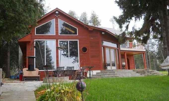 This beautiful private waterfront vacation home is located on the 165+ft of picturesque shorefront in Gills Rock, Wisconsin. The floor to ceiling windows offer a panoramic water view to Hedgehog Harbor from kitchen, dining room, living room and bedroom loft. The magnificent sunsets overlooking Door Bluff can be enjoyed either from inside the house or from the large flagstone private outside patio in the back yard. The patio is great for entertaining with an area for grilling (charcoal grill available; charcoal not provided) and a fire pit (firewood not provided).