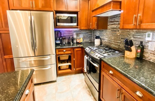 When you enter the home on the main floor, you will be greeted by a cozy den that leads up to the large formal dining room and kitchen. Also on the main floor is the large Master Suite with a private bath and flatscreen TV. Head out to the large private backyard and patio to lounge on the patio furniture, including a hammock. In addition to the den in the entryway, there is also a spacious family room on the 2nd floor, and a formal living space on the 3rd floor. The 2nd floor has 2 more bedrooms, a futon and a full bath in the hall.