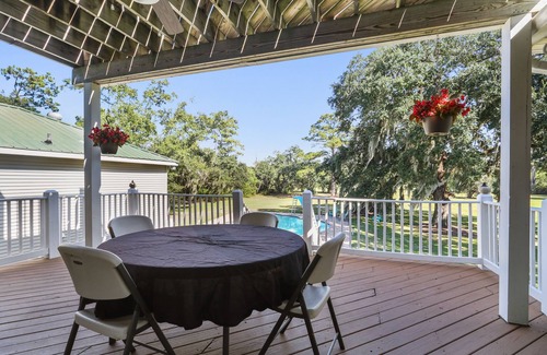 Bayou Moon is a raised Acadian cottage on 8 park-like acres with 550' of water frontage and 30+ live oaks. Enjoy nature's paradise in this newly renovated 100 year old home. See pelicans, egrets, rabbits, fox, deer, and an occasional alligator. Bring your boat or rent one up 'da bayou'. Fish or crab from the pier... or if you prefer, Kenney's Seafood ( 1mi.) has fabulous live and cooked seafood including crawfish. Enjoy water sports on the bayou or relax in the large swimming pool. (The feature on the side of the pool is not a heated spa, it’s is only a shallow seated area). Large back and front porches, as well as ample space to grill and/or boil. Four bedrooms/four baths, three large living areas, gameroom with ping pong, wet bar, stainless appliances in kitchen, granite countertops, and much more. The Master bedroom has a King sized bed, bedroom 2 downstairs has a Queen bed, bedroom 3 downstairs has two Queen beds. Bedroom 4 upstairs has a Full bed. New mattresses and bedding are now in all of the bedrooms and this home is always very clean. This area of Slidell is a 30-35 minute drive to the French Quarter via I-10.