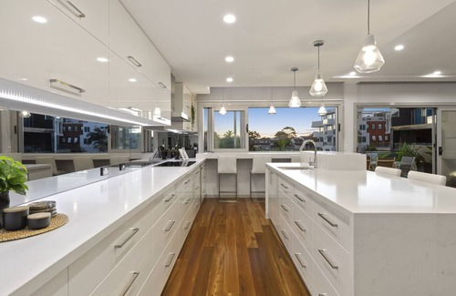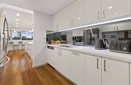 Unparalleled in modern comfort and high end luxury, this architect designed 5 bedroom, 3 living zone waterfront dwelling delivers magnificent state of the art living against a backdrop of sparkling blue water vistas across four breathtaking levels. Lift access to each level. The property is decorated with privately commissioned art collection by Sayer Art and Design; it has premium streamlined Miele kitchen (butler's pantry), luxe bathrooms & lavish upper level parents master retreat and an outdoor undercover 12-person heated spa! Even bed linens and towels are of luxurious quality of brands like Sheridan, Morgan & Finch! Restaurants, bar and shopping are all within walking distance. Golf course, lake and beach are just round the corner.