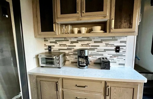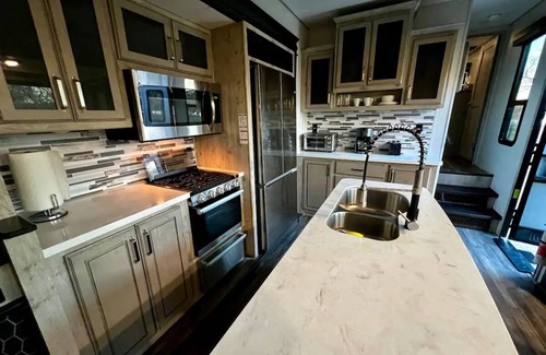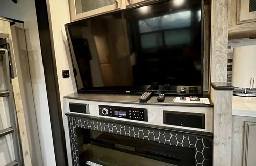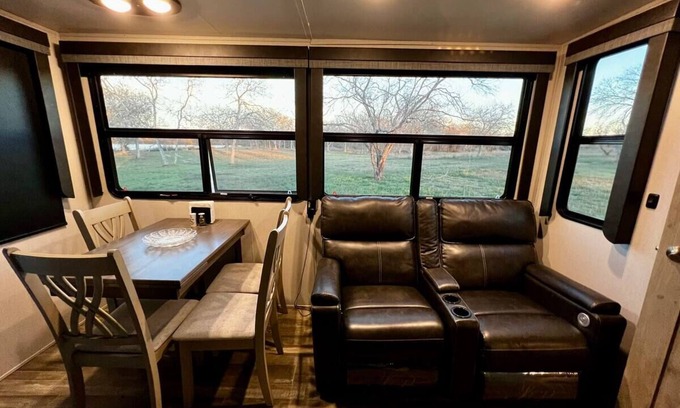 Glamp in style on this 2 bedroom Luxury RV 5th wheel with 2 bedrooms and a loft. The house on wheels is situated on a Ranch with 44 acres and a private lake steps away from your front door. The private lake is stocked with Bass, Catfish, Tilapia & more. Canoes and kayaks are welcome! This Ranch is a paradise for bird watchers and people who want to see deer up close at night!