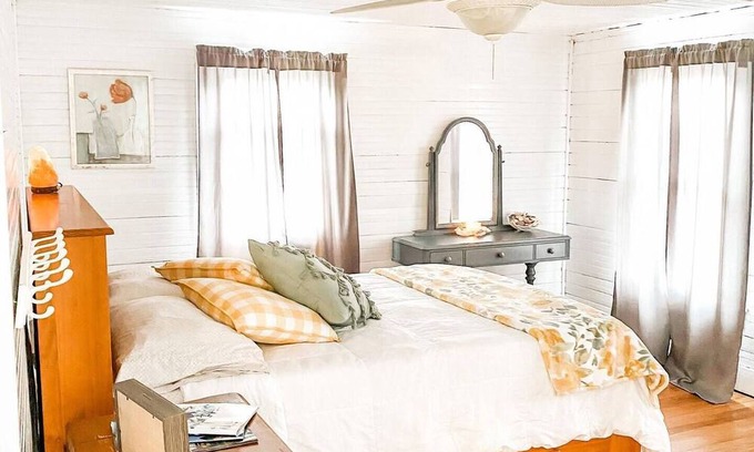 This 1906 charm of a farmhouse is just 15 minutes away from Nags Head beaches and 8 minutes to Roanoke Island yet just far enough to enjoy the wildlife and beauty of the mainland. Enjoy coffee and sunrise on the top deck, or walk about 100 yards to enjoy wine on the dock or go fishing on the Croatan sound. Guest have access to one bedroom with a queen bed, one huge bathroom with two sinks, claw foot tub & shower.