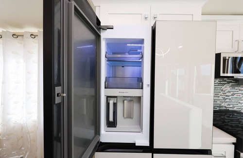 The quartz island and counter tops, new appliances, and well-equipped kitchen has everything you need to cook and dine in, with cookware, a rice cooker, and wine glasses ready for your favorite meals and moments. Plus, you’ll have a washer and dryer to keep things easy during longer stays.