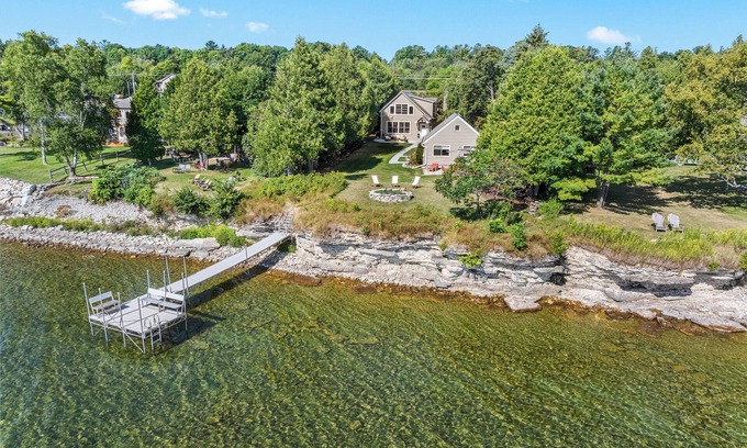 Welcome to Waterfront in Downtown Baileys Harbor: Limestone Edge, an exceptional destination that provides an idyllic setting for your dream wedding. Nestled in the heart of Baileys Harbor, this stunning property offers five spacious bedrooms and four and a half bathrooms spread across two delightful homes, ensuring ample space for you and your guests. Imagine saying "I do" with breathtaking views of Lake Michigan as your backdrop, complemented by the cozy ambiance of a fire pit where you can create unforgettable memories.