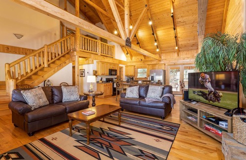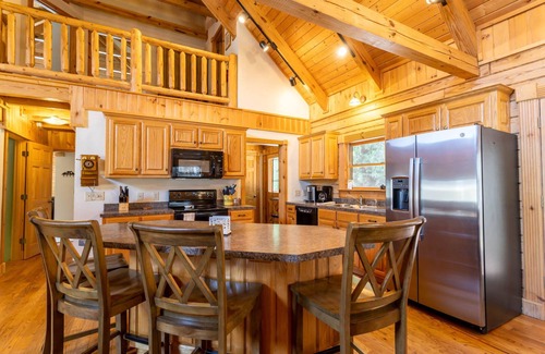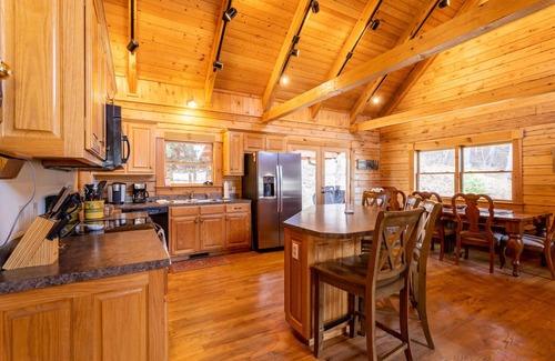 Step into your mountain cabin with an open floor plan overlooking a pastoral view of the pond. The stone fireplace is the centerpiece of the cozy living area, right beside your well-outfitted kitchen and dining space, including a Keurig coffee maker (just bring your own pods). Open the double doors to access the large, private back deck with abundant outdoor seating, a gas grill, and a hot tub that can accommodate seven people.