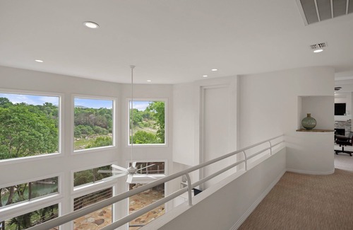 Wake up to views of Lake Travis. The open-concept living area is perfect for gathering, with plenty of natural light, modern furnishings, and a timeless architectural charm.