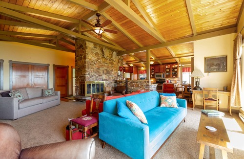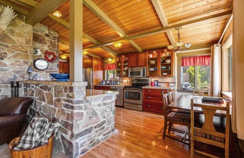 With a gorgeous waterfront setting on the shores of Hood Canal, this two-bedroom home offers all the inviting ambience of a plush Pacific Northwest lodge. You'll find beautiful craftsman features throughout, including vaulted ceilings with exposed natural beams, an impressive stone hearth (but please note that the fireplace is not for guest use), richly hued wood cabinetry, and large picture windows that bring in a commanding view of the water. When the weather's fine, you can bring a mug of coffee out to the deck and watch for passing otters in the morning or get the gas grill going for a barbecue lunch at the picnic table on the sheltered patio.
