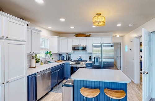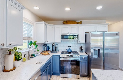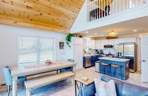The home's interior provides a wonderful sense of brightness and easy modernity. Anchored by a gas fireplace with a floor-to-ceiling hearth, the great room has plentiful seating, a large dining table, and an open view of the kitchen with its two-toned cabinets and stainless steel appliances. In the evenings, pile on the sofa in the den, stream your favorite movies, and retire to one of five bedrooms - including a kids' room with bunks, a boat bed, a smart TV, and a selection of toys, books, and games.
