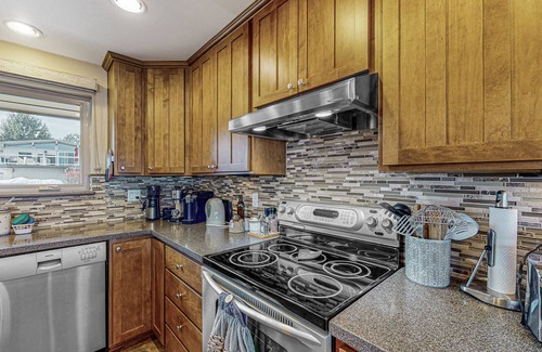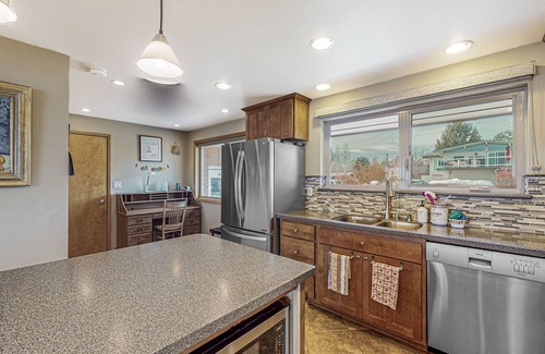 The Columbia is on full display inside as well, with direct river views both upstairs and down. Enjoy an open living and dining area with east-facing picture windows and a well-appointed kitchen with stainless steel appliances, an espresso maker, an Instant Pot, a food processor, an electric griddle, and other bonus tools. This is also an ideal place to work from home, with two offices on the main floor, a desk in the kitchen, and workspaces in two downstairs bedrooms.