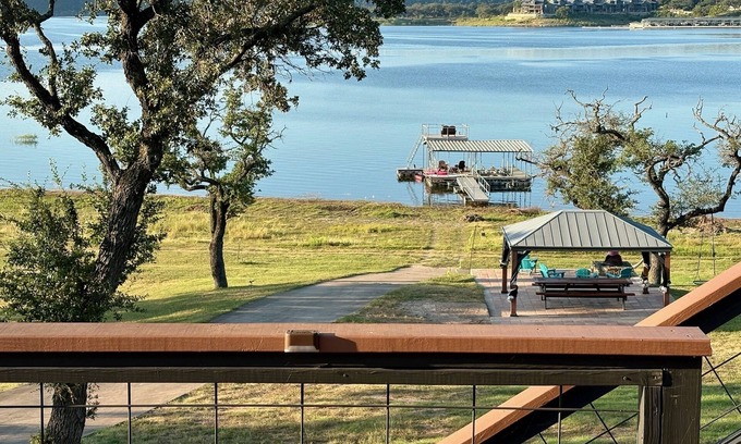 This stunning modern waterfront home offers an idyllic setting for wedding stays, combining elegance and comfort in a picturesque location near Austin. With its beautiful open layout and breathtaking views, this property is ready to accommodate your special day.