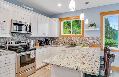 Whip up delicious dishes in the sparkling full kitchen, with stainless steel appliances and generous stone counter space. Then cozy up for game nights in the comfy living area, where a sound-view wall of windows provides gorgeous scenery. On the waterfront deck, kick back in an Adirondack chair while dinner sizzles on the grill. Then dine alfresco with an incredible vista. The home looks out onto the shipping lanes so you can witness Puget Sound commerce with freighters, aircraft carriers, and private and commercial boats. On clear days, you can see the snow-covered peaks of the Cascade Range, and in the mornings - the beautiful sunrise. Mt. Baker is clearly visible to the northeast. The resident bald eagles talk and put on a show, the seals and river otters entertain in the water and the great blue herons fish in the shallows. You’ll see an occasional deer with fawns on the beach and on the road.