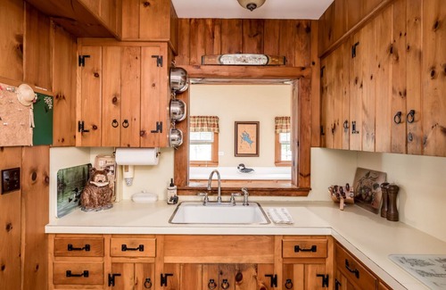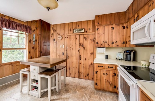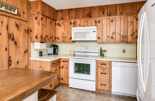 The spacious and well-equipped kitchen features plenty of counterspace for meal preparation, and ample cabinetry for storage, as well as a washer and dryer. There is also a breakfast bar with seating for four, and a large table in the dining room that can seat eight. There is a second refrigerator in the mudroom.
