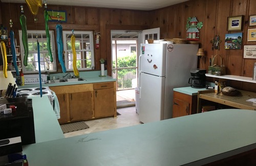 Dine inside or out. The bar counter in the kitchen seats 6 and a round table seats 4-5 more. The large picnic table on the front porch seats up to 8.