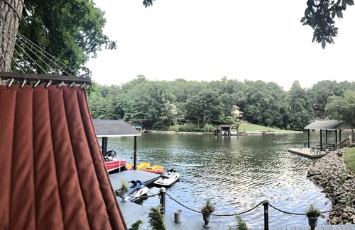 Very private, nestled in the woods. A four bedroom (two are master suites) four bath home that is literally steps from the beautiful lake! Perfect for multiple family vacations. Large open dining and living area with cathedral ceiling overlooking the lake. So many places to sit and relax; upper vinyl deck with tables and outdoor furniture, covered porch a hot tub and porch swing. 40 foot stationary dock connected to two floating docks with plenty of seating and a hammock area with sand. Spacious den that has HD satellite tv and pool table. Fast Xfinity WiFi, 85" Surround sound Theater, Play room with foosball table and PlayStation/Wii gaming, toys, and additional sleeping.Fire pit(wood provide) pedal boat, paddle board, 3 kayaks and life jackets, floats, some fishing equipment included. Seven person water carpet. Hours of entertainment for the kids!!