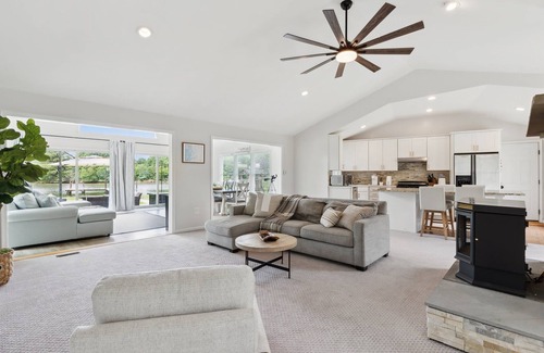 Step outside to enjoy the large yard, perfect for lawn games and outdoor lounging. The private dock offers direct water access. Bring your kayaks or just take in the views. After sunset, gather around the fire pit or soak in the hot tub under the stars.