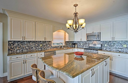 The open floor plan of this 1,800-square-foot lake house allows for plenty of space for your whole group to spread out and unwind! Kick back on the leather furniture in the living room and admire the fantastic lake views through the floor-to-ceiling windows and sliding glass doors.