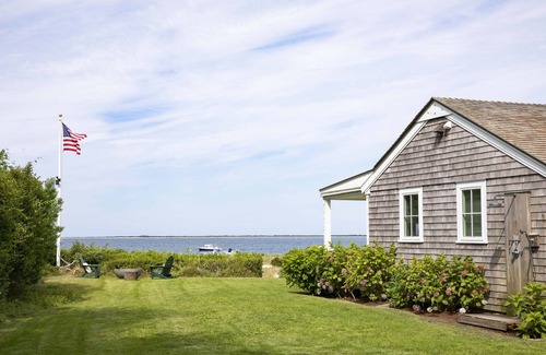 COTTAGE -Sweeping views of Nantucket harbor dominate the 20' x 30' great room with cathedral ceilings, custom millwork, top of the line appliances (wolf, subzero), 42" flat screen TV and cozy sectional. Enjoy morning coffee from the tranquility of your covered porch overlooking the beach or cocktails while watching the sun set over the harbor.